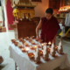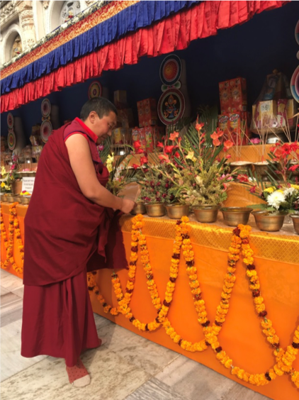 Monk tending to flower and shrine offering at Bodhgaya during Monlam Dec 2017/